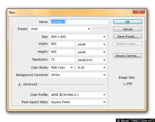 1. 800px X 600px ebatında (Size), RGB renk türünde (Color mode) ve 8bit, 72 çözünürlükte (Resolution) yeni döküman oluşturun