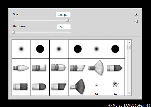 1. Beyaz renkte Brush tool (Klavyede B) aracını seçin ve 1000px boyutunda fırça ile merkezi boyayın